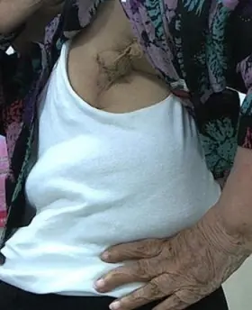 (照片2) Z♀85歲 左乳癌手術後造成之"左肩項緊左腋下繃緊感",據患者描述"似穿盔甲"已數個月。