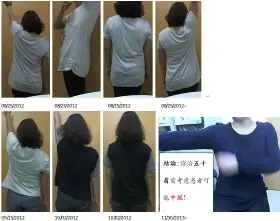 08/25:當要求患者舉左手時,左上臂舉手艱難:僅能側前舉且左肩胛骨明顯代償後移,站姿呈現明顯左肩高。